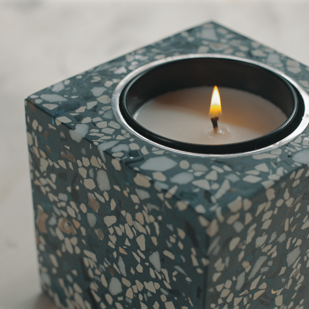 Per valorizzare la nostra collezione di candele, abbiamo creato un pezzo unico realizzato a mano con la tecnica del Terrazzo.